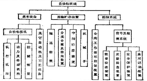 包裝生產(chǎn)線是由很基本的工藝設(shè)備——包裝機(jī)以及將包裝機(jī)聯(lián)線的輔助設(shè)備,如輸送裝置等,并依靠推動控制系統(tǒng)完成確定的工作循環(huán)。自動包裝生產(chǎn)線基本組成框架如下: